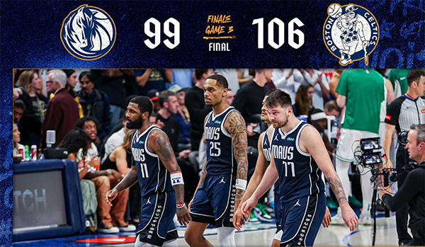 JRS直播网讯 NBA总决赛G3打得跌宕起伏,凯尔特人106-99击败独行侠,大比分3-0领先,斩获总冠军点,再赢一场就可以夺冠。独行侠开场9-2领先,一度领先凯尔特人两位数,在塔图姆的带领下,双方鏖战,凯尔特人上半场落后1分。第三节,杰伦布朗单节轰下15分,凯尔特人领先对手15分,并且在第四节初期顺利将差距拉大到21分。不过主场作战的独行侠不放弃,一波22-2缩小分差,东契奇6次犯规被罚下,凯尔特人顶住压力,布朗和怀特关键球,取得胜利,3-0领先的情况下,夺冠在即。