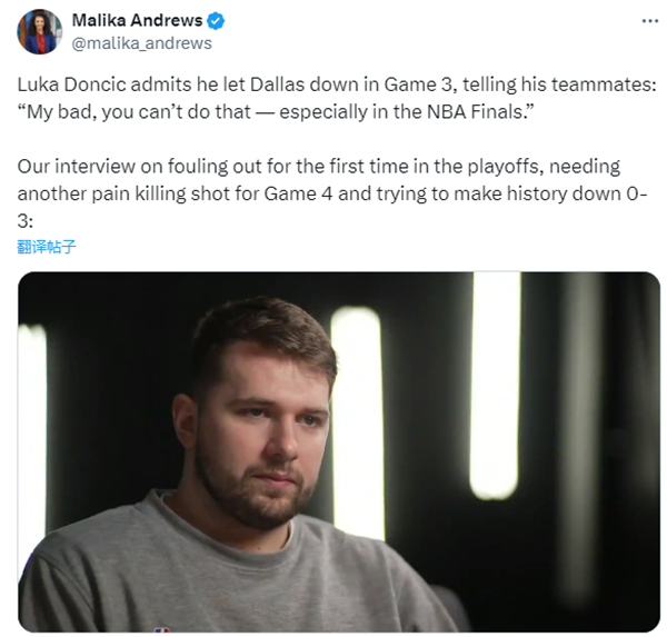 东契奇还透露,昨日赛后他向他的队友们道了歉,东契奇表示:我告诉他们这是我的错,我不能那样做,尤其是在NBA总决赛中,常规赛或许会有点不同,但你不能在总决赛中这样做。