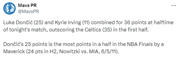 4、东契奇半场25分超越诺维茨基,创独行侠球员总决赛半场得分新高,诺天王曾在2011年总决赛对阵热火时上半场拿到24分。