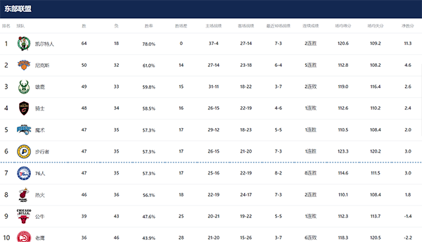常规赛他们的战绩是64胜18负,胜率高达78%,排名常规赛第一。凯尔特人是联盟中唯一一支胜场数达到60+、胜率破70%的队伍,在塔图姆、霍乐迪和杰伦布朗的带领下,他们打得非常出色,联盟第一的战绩解锁季后赛全部的主场资格。
