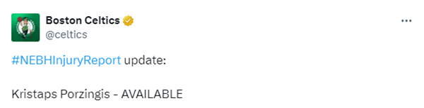 距离比赛开打还差2个小时,凯尔特人官方正式宣布,波尔津吉斯可以出战G5;绿军主帅马祖拉表示:他今天可以打!我们今天会在赛场上见到他,他今天的状态与上一场不同,没有上场时间限制。