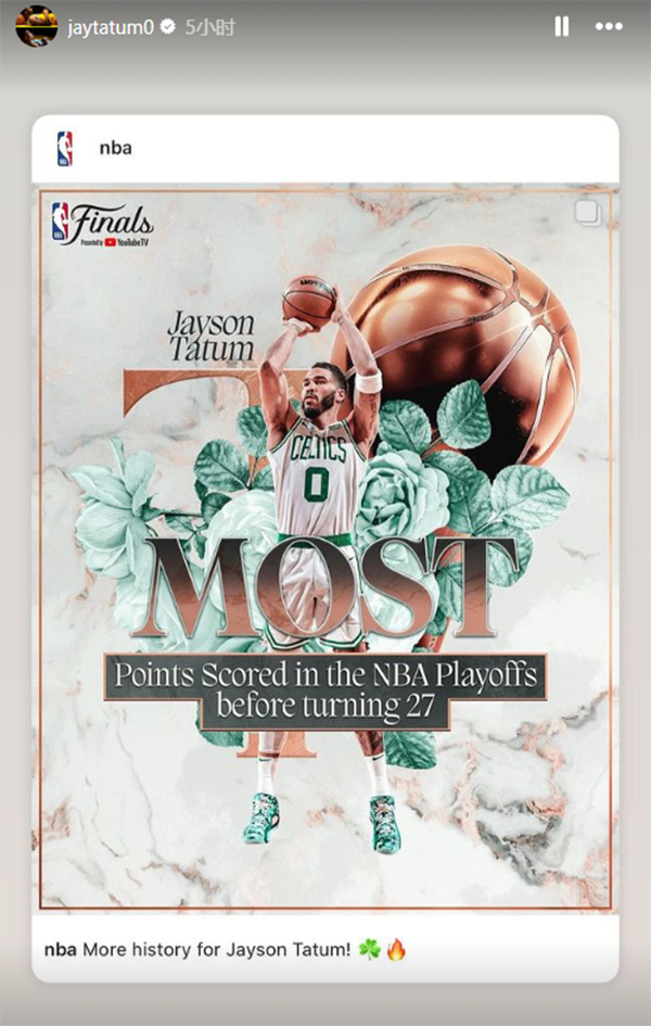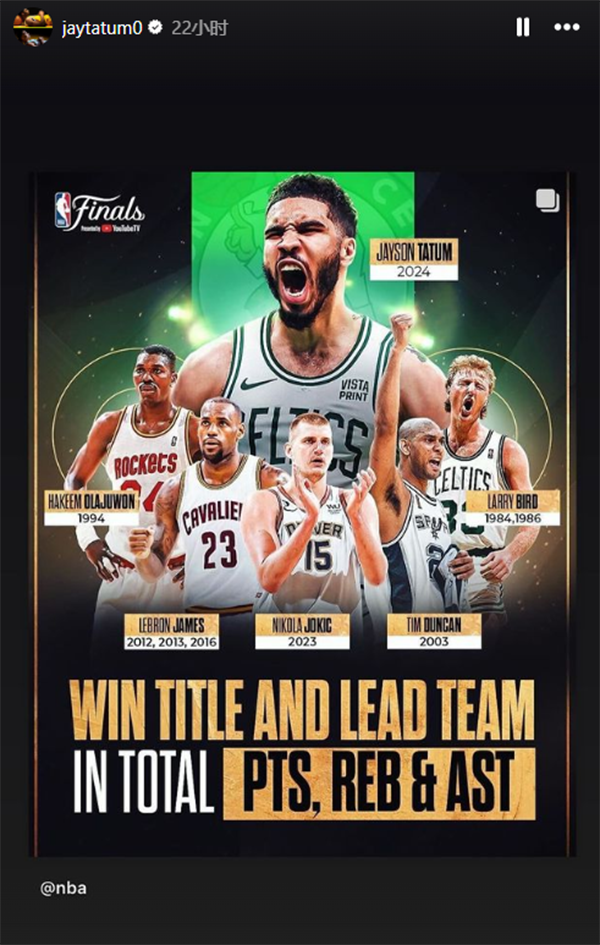 塔图姆转发比肩詹姆斯邓肯等人的伟大纪录——在夺冠赛季,塔图姆的季后赛得分、篮板、助攻皆队内第一;比肩詹姆斯、约基奇、大梦、邓肯和伯德成为历史第6人。