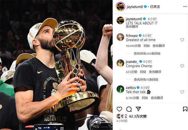 JRS直播网讯 北京时间6月20日,凯尔特人球星杰森-塔图姆更新社交媒体,晒照庆祝夺得总冠军引热议,詹姆斯领衔众星点赞,布朗狂赞历史最佳。