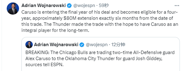 JRS直播网讯 北京时间6月21日,NBA休赛期第一笔交易来了,据名记woj报道,消息人士透露,公牛将卡鲁索送至雷霆,换回约什-基迪;从交易之日起六个月内,卡鲁索有资格获得一份为期四年、价值约 8000 万美元的续约合同。
