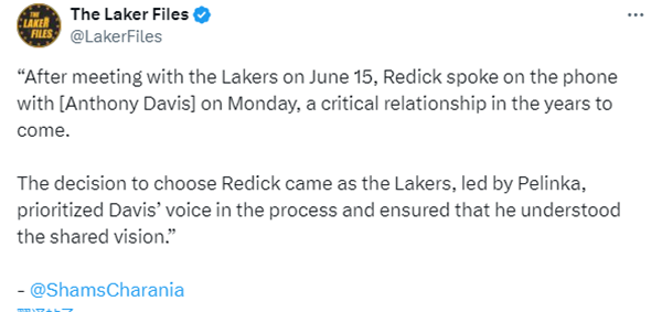据悉,与湖人面谈后雷迪克与浓眉进行了电话交谈并且获得了浓眉的支持,这将是未来几年至关重要的关系;另外雷迪克计划培养里夫斯、八村垒和克里斯蒂等年轻人。