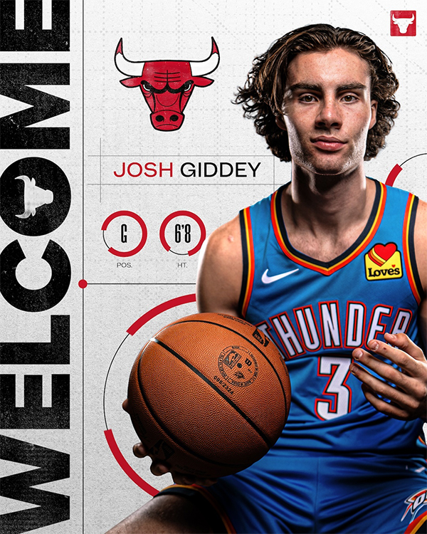 今年休赛期,雷霆和公牛达成1换1交易,雷霆将约什-基迪交易至公牛从而换来卡鲁索,两队均已官宣交易达成,公牛欢迎吉迪来到芝加哥。