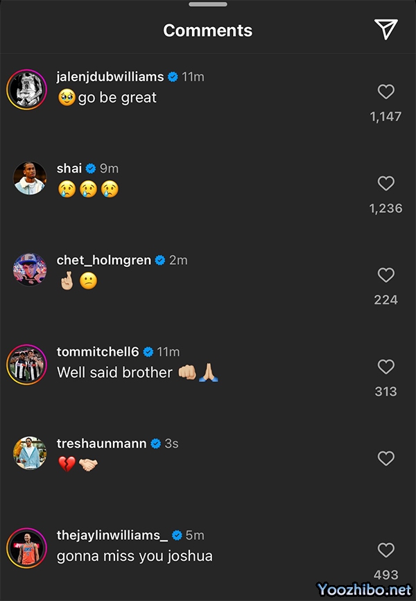 雷霆众球员纷纷告别吉迪,亚历山大在评论区回复哭泣表情,杰伦-威廉姆斯:去变得伟大;杰林-威廉姆斯:我们会想念你的。
