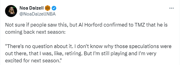 霍福德的妹妹发推回应:关于艾尔(霍福德)退役的传闻总是很奇怪。如果他是一个在替补席偶尔才有机会出场的球员,那就算了。但他是在季后赛大部分比赛里首发出场,并且对凯尔特人这赛季取得成功至关重要的球员;当他仍然是联盟中最好的大个子之一时,年龄其实并不重要了。