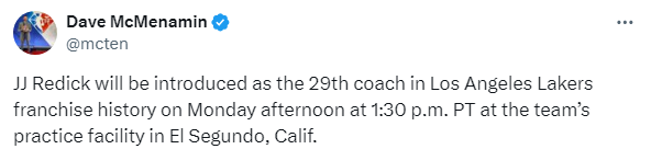 JRS直播网讯 北京时间6月24日,湖人官方宣布,他们将在明天凌晨1点30分为新帅雷迪克召开新闻发布会,位置是加利福尼亚州埃尔塞贡多的球队训练场,湖人将正式宣布雷迪克成为球队历史上的第29任主教练。
