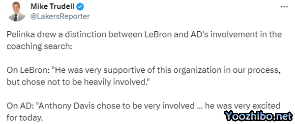湖人两位当家球星是否都参与了选帅,湖人总经理佩林卡表示:詹姆斯非常支持球队,但选择不深入参与。安东尼-戴维斯选择全身心投入,他对今天的结果感到非常兴奋,他很高兴雷迪克成为球队的主帅。