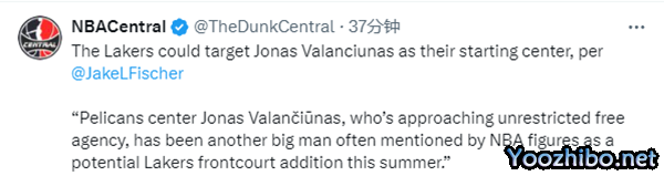 Jake Fischer还报道,NBA相关人士近日常常谈到,瓦兰丘纳斯是湖人今夏的潜在补强目标,湖人计划让他担任球队的先发中锋。