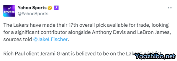据Jake Fischer报道,湖人希望补强前场,消息人士称,湖人正寻求交易今年的首轮17号签,因为湖人已经评估了市场上能与詹姆斯浓眉一起做出重大贡献的球员,湖人曾在今年2月交易截止日与老鹰认真谈判穆雷交易;Klutch Sports首席执行官Rich Paul的客户杰拉米-格兰特是湖人愿望清单上的一个潜在目标。