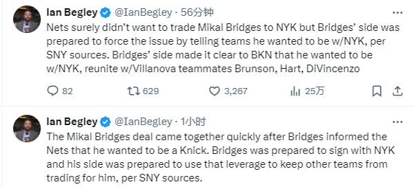 尼克斯记者Ian Begley跟进报道,消息人士透露,在本周早些时候,布里奇斯要求篮网将他交易至尼克斯。