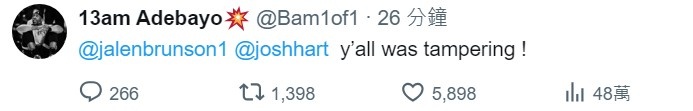 热火中锋阿德巴约评论道:“布伦森,哈特,你们都在搞鬼。