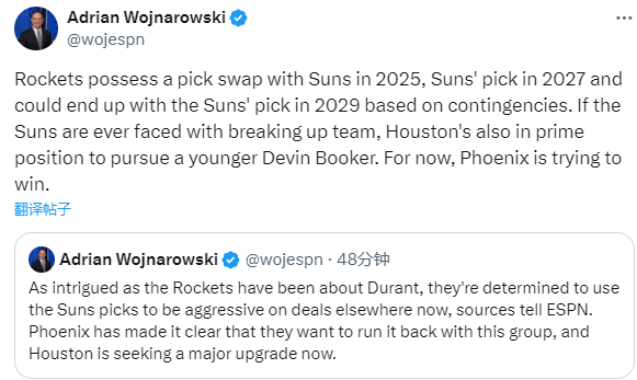 Woj补充表示:火箭收拾首轮签是想换杜兰特,火箭还想追布克。