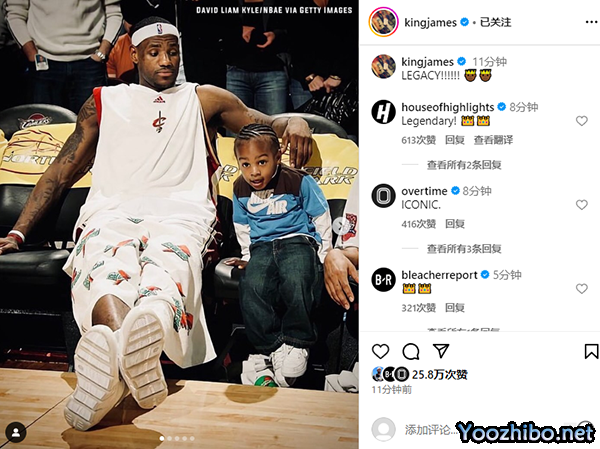 詹姆斯更新社媒祝贺儿子成为湖人队的一员,晒父子骑士时期合影、父子同场训练暴扣等画面,配文写道:LEGACY(传承)。
