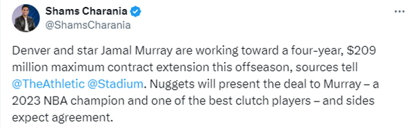 JRS直播网讯 北京时间6月28日,据名记shams报道,掘金将与贾马尔-穆雷达成4年2.09亿提前续约合同,波普拒绝球员选项试水自由球员市场。