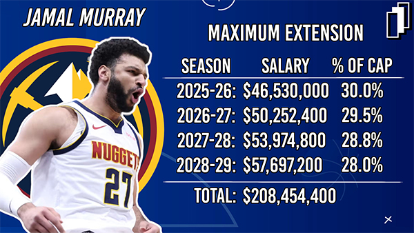 穆雷提前续签4年2.09亿,年薪逐年增加,合同细节为——25-26赛季年薪为4653万美元,26-27赛季年薪为5025万美元;27-28赛季年薪为5397万美元;28-29赛季年薪为5770万美元。