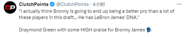 对于布朗尼的未来,追梦格林表示:我真的认为布朗尼最终会成为比这次选秀中的很多球员更优秀的职业球员,他拥有勒布朗-詹姆斯的基因(DNA)。