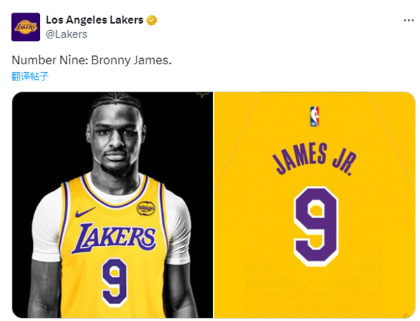 今日湖人官宣克内克特将穿4号球衣,布朗尼将穿9号球衣,在布朗尼球衣的后面写着“小詹姆斯”和“9号”的字样。