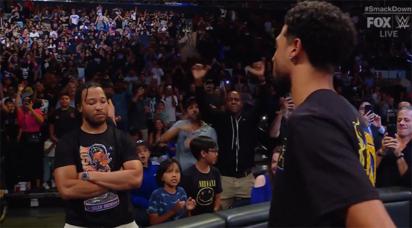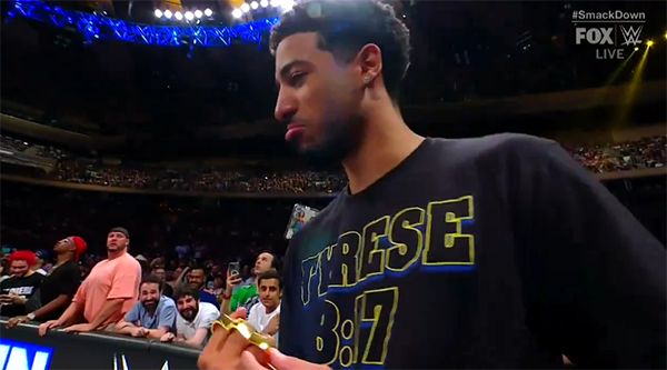 JRS直播网讯 北京时间6月29日,NBA球星布伦森和哈利伯顿现身观看WWE,两人相遇后互瞪对方,之后哈利伯顿戴着指虎与布伦森对峙,随后布伦森拿着椅子上台欲砸哈利伯顿并且成功将其赶下台,两人用演技把恩怨带到了WWE赛场。