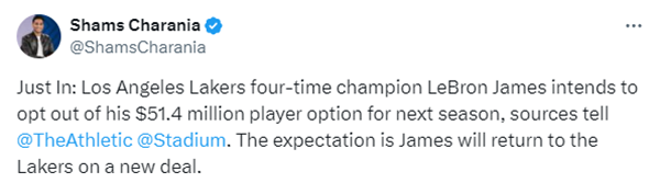 JRS直播网讯 北京时间6月30日,据名记shams报道,詹姆斯已经决定拒绝执行与湖人最后一年价值5140万美元的球员选项,跳出合同成为自由球员,预计将与湖人续约;名记Haynes报道詹姆斯考虑降薪续约,旨在帮助球队补强从而继续冲冠。