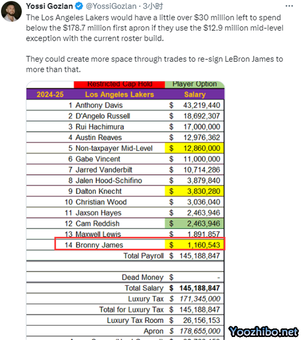 JRS直播网讯 北京时间6月30日,湖人一夜动态,詹姆斯跳出合同,预计与湖人续约且愿意降薪续约;雷迪什执行球员选项,湖人队内现有14名球员(包括将续约的詹姆斯),布朗尼新秀赛季的年薪曝光,预估为116万美元。