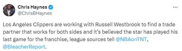 名记Chris报道,洛杉矶快船队正在与威少合作,寻找一个对双方都有利的交易伙伴,据悉,威少已经为快船队打了最后一场比赛;-快船目前的计划就是交易威斯布鲁克,如果没有成功,你可以预计到快船最终将在新赛季开始前裁掉他。