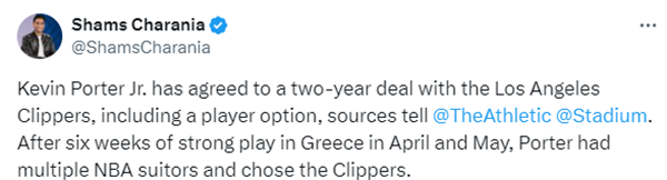 据最新报道,快船已经和火箭旧将小凯文-波特签下2年合同,第二年为球员选项;小波特曾因家暴女友被火箭开除,而且4年8250万美元合同被废除,上赛季只能前往海外联赛打球;如今他加盟快船重返NBA。