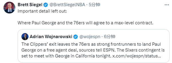 据woj报道,在自由球员交易市场开启后,乔治的经纪人和快船总裁进行了一次短暂的沟通,没能达成续约协议,双方都达成共识,乔治不太可能回归快船;woj还表示,76人是乔治下家的领跑者,双方今天就要在加州会面。