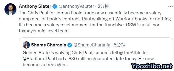 JRS直播网讯 39岁保罗的勇士生涯结束了,据名记shams报道,勇士将裁掉保罗,后者成为自由球员,将以底薪签约其他球队。