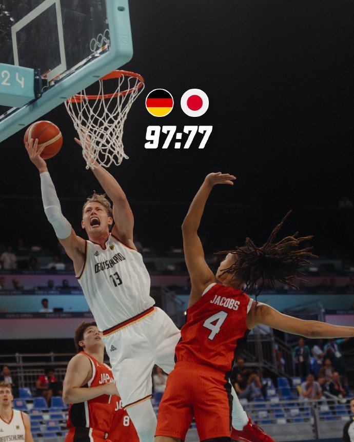 JRS直播网讯 7月27日讯 奥运男篮小组赛B组,德国对阵日本。开场后施罗德和泰斯两人联手带领德国建立领先,日本则连续命中三分将比分咬住。第二节德国有内有外一度建立起16分优势,河村勇辉和八村塁又帮助日本稳住阵脚将分差拉回个位数。易边再战,德国多点开花再次打出攻势将分差拉开,第四节日本也无力缩小分差,最终德国97-77轻松击败日本取得开门红。