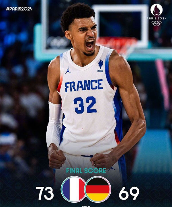 JRS直播网8月9日讯 奥运会男篮进入半决赛争夺,东道主法国迎战世界杯冠军德国男篮。两支同为B组的球队已经有过一次对决,当时德国男篮14分的优势击败法国男篮。首节开局德国男篮打出灵活的进攻,施罗德和小瓦格纳各自命中三分带队送出12-2的攻势抢占先机;法国在暂停回来后逐渐找到状态,但外线失准成为限制他们的关键,整个上半场他们三分球12投1中让局面很被动。不过好在他们防守端在线并成功遏制住德国男篮核心之一的施罗德,而整个第二节他们仅丢8分表现堪称完美,他们以此为基础在一度落后10分的情况下送出15-5的攻势扳平比分结束上半场。休息归来巴图姆的三分帮助法国男篮取得本场第一次领先,而他们三分手感稍稍回暖也帮助他们占据上风,末节文班亚马也在外线命中三分,士气大涨的法国10-3开局将优势扩大至两位数;顽强的德国在读秒阶段追至2分看到希望,不过德国最后时刻出现致命失误让出了绝平甚至绝杀球权,法国则在罚球大战中守住胜利。最终,法国男篮73-69力克德国男篮率先杀入决赛。