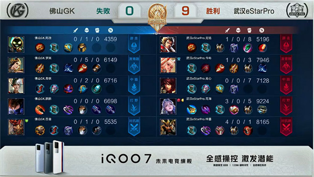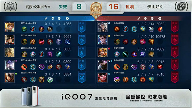 开局武汉ES蒙犽中路抢线。1分整佛山GK反掉敌方蓝BUFF。2分04秒对抗路团战武汉ES打出0换3。3分55秒双方中路1换1。4分46秒武汉ES拿下暴君。6分37秒野区团战佛山GK打出1换2。7分20秒野区团战佛山GK打出1换5。9分17秒佛山GK拿下暴君。9分46秒佛山GK野区击杀孙膑。10分18秒佛山GK暴君处击杀张良。11分34秒佛山GK摧毁敌方对抗路二塔。11分53秒佛山GK拿下暗影主宰。12分11秒佛山GK野区打出1换5。12分40秒佛山GK摧毁敌方水晶拿下比赛。