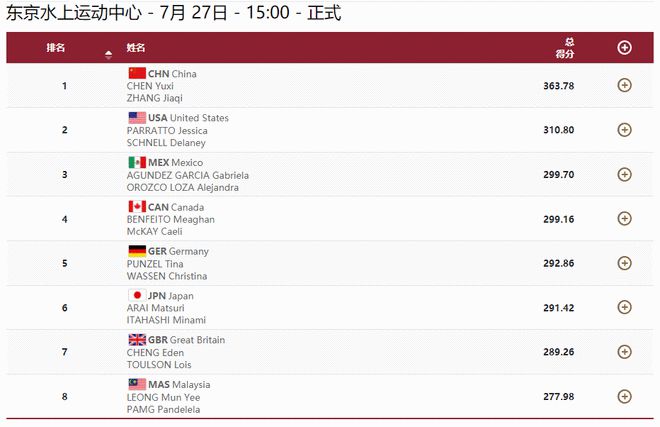 最后一轮的比赛,陈芋汐/张家齐选择的是难度系数为3.2的5253B向后翻腾两周半转体一周半屈体,这一跳她们得到了84.48分,轮次排名第一位,总成绩363.78分夺得冠军,也帮助了中国队实现了该项目的六连冠。美国组合帕拉托/施内尔在5253B上拿到了78.72分,轮次排名第二位,总成绩310.80分获得银牌,也成为了历史上第一组在该项目站上奥运会领奖台的美国运动员!墨西哥组合加西亚/欧罗佐在5253B上拿到了71.04分,轮次并列排名第四位,总成绩299.70分获得铜牌。