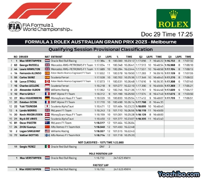 JRS直播网讯 北京时间04月01日,2023年F1澳大利亚大奖赛排位赛在墨尔本赛道结束,红牛车队维斯塔潘拿到杆位,梅赛德斯车队拉塞尔和汉密尔顿二三名。阿斯顿马丁车队阿隆索第四。