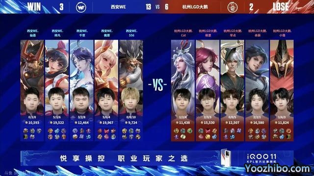 决胜局,西安WE蓝色方,拿到了娜可露露+公孙离。杭州LGD大鹅红色方,拿到了曜+伽罗。开局西安WE击杀明世隐,拿下一血。15分钟,西安WE直推中路一塔。17分钟,西安WE直推上路高地,经济差拉开七千。决胜团,西安WE击杀伽罗,一波零换四,直推水晶,拿下最终胜利。