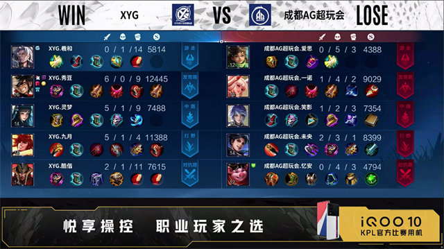 第一局开局成都AG对抗路、发育路换线。51秒成都AG中路下河道处击杀张飞拿下一血。2分10秒中路团成都AG中路击杀沈梦溪。3分10秒成都AG拿下暴君。3分37秒XYG拿下先知主宰,成都AG主宰处击杀猪八戒。4分25秒野区团XYG打出1换2。5分46秒成都AG摧毁敌方发育路外塔。5分20秒中路团XYG打出2换4,随后摧毁敌方中路外塔。7分57秒XYG摧毁敌方对抗路外塔。8分45秒XYG野区击杀孙膑,随后摧毁敌方中路二塔。9分12秒XYG拿下主宰。10分20秒中路团XYG打出0换2。10分57秒XYG发育路击杀蒙恬,随后摧毁敌方发育路高地塔。11分56秒XYG拿下暗影主宰。12分24秒XYG摧毁敌方对抗路二塔。13分钟发育路团XYG打出1换4。13分36秒双方水晶处打出1换1。13分39秒XYG摧毁敌方水晶拿下比赛。
