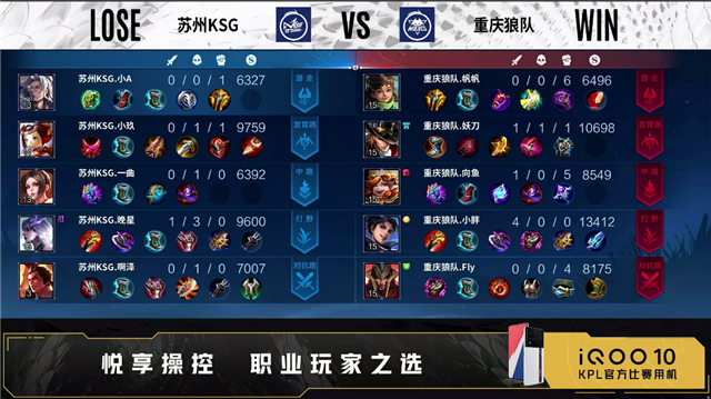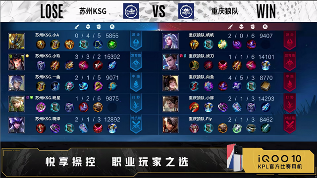 第五局开局苏州KSG发育路、对抗路换线。1分13秒重庆狼队中路下河道处击杀张良拿下一血。1分33秒重庆狼队野区击杀张飞。2分24秒重庆狼队发育路击杀橘右京。2分41秒重庆狼队中路击杀马可波罗。3分28秒对抗路团重庆狼队打出0换2。3分47秒重庆狼队中路击杀蒙恬。4分21秒重庆狼队野区击杀张飞。4分37秒重庆狼队中路击杀张良后摧毁敌方中路外塔。5分10秒重庆狼队摧毁敌方对抗路外塔。5分22秒重庆狼队拿下暴君。5分41秒重庆狼队摧毁敌方发育路外塔。6分12秒重庆狼队摧毁敌方中路二塔。6分30秒重庆狼队摧毁敌方对抗路二塔。7分17秒重庆狼队对抗路击杀橘右京。7分52秒重庆狼队摧毁敌方中路高地塔。8分钟对抗路团双方1换1。8分39秒重庆狼队拿下主宰。9分43秒重庆狼队摧毁敌方对抗路高地塔。10分15秒中路团重庆狼队打出0换2。10分38秒高地团重庆狼队打出1换2。11分44秒重庆狼队拿下暗影主宰。12分09秒重庆狼队拿下暗影暴君。12分23秒苏州KSG摧毁敌方对抗路外塔。12分40秒重庆狼队摧毁敌方发育路二塔。13分04秒重庆狼队摧毁敌方发育路高地塔。13分25秒重庆狼队摧毁敌方水晶拿下比赛。