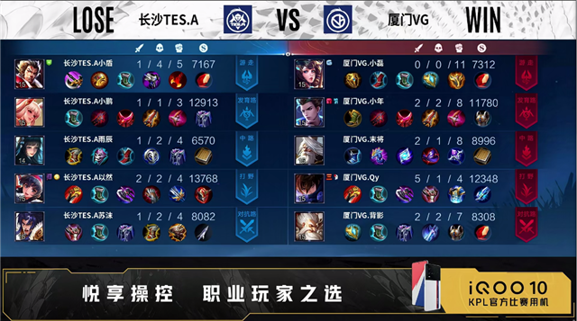 第一局开局厦门VG成功反掉敌方蓝Buff。4分12秒双方游走野区互换。4分34秒长沙TES.A摧毁敌方发育路外塔。5分25秒长沙TES.A拿下暴君。6分09秒厦门VG摧毁敌方对抗路外塔,随后中路击杀狄仁杰。6分37秒厦门VG拿下先知主宰。7分30秒厦门VG摧毁敌方对抗路二塔。7分40秒中路上河道团厦门VG击杀蒙恬,长沙TES.A摧毁敌方中路外塔。9分05秒野区团厦门VG打出1换2。9分35秒厦门VG拿下暴君。10分15秒厦门VG拿下暗影主宰,随后摧毁敌方中路外塔。11分钟厦门VG摧毁敌方发育路二塔。11分10秒厦门VG高地处击杀沈梦溪,随后摧毁敌方发育路高地塔。11分55秒厦门VG拿下暗影暴君。12分59秒厦门VG摧毁敌方对抗路高地塔。13分20秒中路团厦门VG打出2换4。14分48秒厦门VG拿下暗影主宰。15分40秒厦门VG拿下暗影暴君。16分钟双方高地处1换1,厦门VG摧毁敌方中路高地塔。18分11秒高地团长沙TES.A打出1换2。18分44秒厦门VG拿下暗影主宰。19分26秒长沙TES.A拿下暗影暴君。20分21秒厦门VG拿下风暴龙王,中路团长沙TES.A击杀猪八戒。21分50秒中路团厦门VG打出1换2。22分16秒厦门VG摧毁敌方水晶拿下比赛。