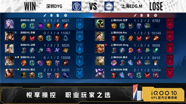 开局双方正常抢线。2分40秒野区深圳DYG击杀孙尚香,拿下一血,打出0换2。3分20秒上海EDG.M拿下暴君。3分56秒中路深圳DYG击杀娜可露露,打出0换2,摧毁敌方发育路外塔。5分07秒深圳DYG拿下主宰,摧毁敌方对抗路外塔。7分36秒深圳DYG拿下暴君。8分34秒深圳DYG摧毁敌方对抗路二塔中路外塔,9分31秒拿下主宰。10分27秒深圳DYG拿下暗影主宰、暗影暴君。11分45秒深圳DYG摧毁敌方发育路二塔、中路二塔,12分24秒摧毁敌方中路高地,14分13秒拿下暗影主宰。15分13秒深圳DYG摧毁敌方对抗路高地、发育路高地,拿下暗影暴君。16分20秒高地上海EDG.M击杀盾山,深圳DYG花木兰二连击破,打出3换3,摧毁水晶拿下比赛。
