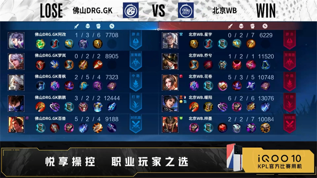 开局北京WB边射换线。1分06秒中路北京WB击杀姜子牙,拿下一血。2分27秒北京WB拿下暴君,发育路北京WB击杀姜子牙,打出2换1。5分31秒对抗路佛山DRG.GK击杀不知火舞,打出0换2,北京WB摧毁敌方发育路外塔。7分23秒北京WB摧毁敌方对抗路外塔,拿下主宰,佛山DRG.GK摧毁敌方发育路外塔。8分38秒河道佛山DRG.GK击杀蒙恬,打出0换3,摧毁敌方中路外塔。10分42秒对抗路佛山DRG.GK击杀马可波罗,打出0换2。11分10秒野区北京WB曜三连决胜,佛山DRG.GK吕布二连击破,打出2换4。12分46秒佛山DRG.GK拿下暗影主宰,发育路北京WB击杀刘邦,摧毁敌方发育路二塔。15分01秒佛山DRG.GK拿下暗影暴君。15分40秒佛山DRG.GK摧毁敌方发育路二塔,野区北京WB击杀姜子牙,打出0换4,摧毁敌方对抗路二塔、高地,击杀澜,团灭对手摧毁水晶拿下比赛。