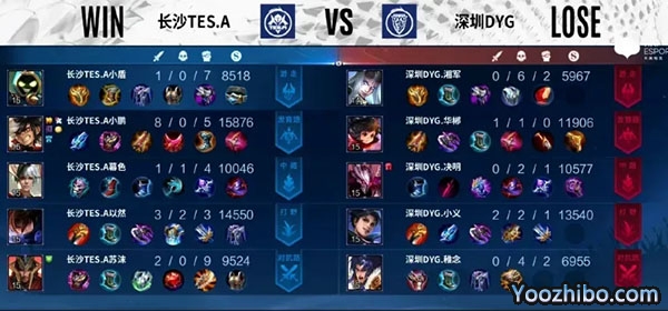 开局22秒,深圳DYG击杀明世隐,拿下超快一血,前期双方再无其他人头爆发,互为均势;中期,小义澜找到机会单点击破,深圳DYG经济略微领先;后期长沙TES.A运营兵线直上高地,抓对面掉点找到节奏;风暴龙王团战,以然阿古朵拿到龙王,随后长沙TES.A反打打出一换二;最后一波,长沙TES.A团战一换五,顺势推上水晶,先下一城!