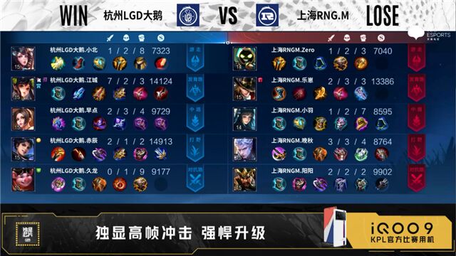 JRS直播网讯 北京时间07月14日,2022年KPL职业联赛夏季赛常规赛第二阶段第三周第二个比赛日第一场比赛结果已经尘埃落定,最终的比赛结果是:上海RNG.M三比二战胜杭州LGD大鹅。
