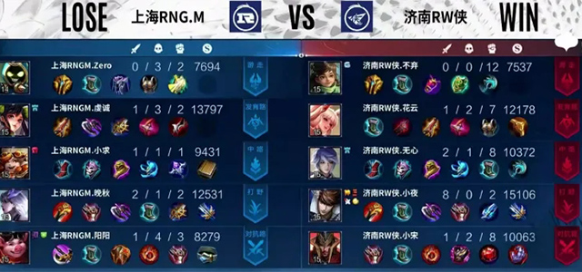 前期上海RNG.M在中路发起进攻,两度完成击杀,而济南RW侠在下路的对拼中占据优势,击杀对方射辅。中期东皇太一果断开团,济南RW侠造成减员后,顺势入侵蓝区,随后澜在中路推回C位,济南RW侠击杀四人,掌控场上局势。决胜团中,吕布刀刀致命,小夜澜收割全场,济南RW侠再度击杀四人后,直点水晶,获得本场胜利!