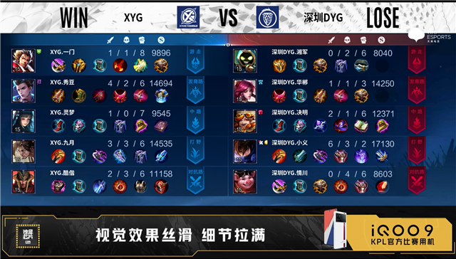 开局双方正常抢线。56秒野区XYG击杀东皇太一拿下一血,深圳DYG击杀两人打出1换2。4分57秒XYG拿下暴君,对抗路XYG击杀吕布,摧毁敌方对抗路外塔,深圳DYG摧毁敌方发育路外塔。6分19秒野区团战XYG打出1换2。7分38秒XYG拿下主宰,发育路深圳DYG击杀大乔。8分52秒野区处深圳DYG娜可露露二连击破,打出2换2。8分35秒深圳DYG拿下暴君。10分25秒深圳DYG拿下暗影主宰,XYG打出0换3,摧毁敌方中路二塔、高地。13分01秒野区XYG 1换5,团灭对手摧毁水晶拿下比赛。