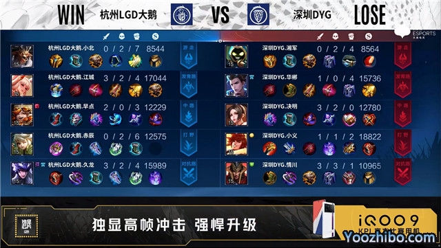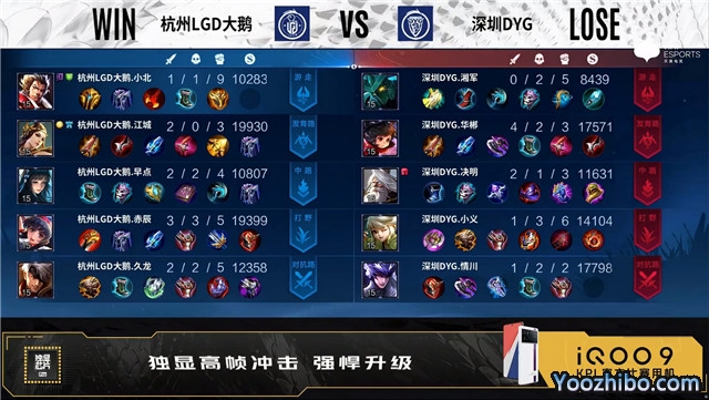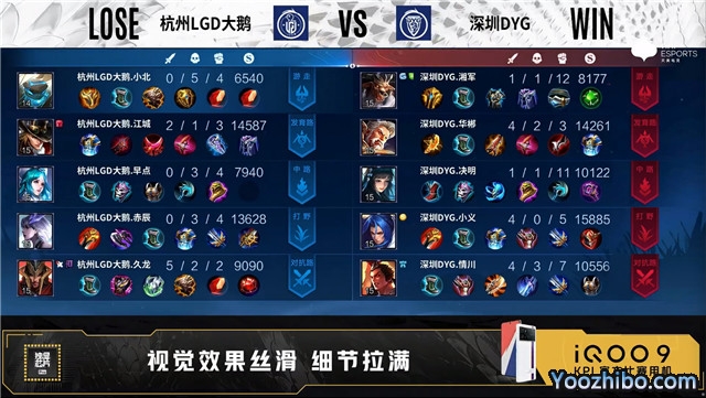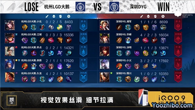 开局杭州LGD大鹅蒙犽中路抢线。3分06秒深圳DYG发育路击杀蒙犽拿到一血。5分24秒杭州LGD大鹅发育路击杀东皇太一。6分13秒暴君处团战深圳DYG击杀孙膑。7分35秒深圳DYG拿下暗影暴君。10分31秒深圳DYG拿下暗影主宰。12分15秒深圳DYG拿下暗影暴君并击杀猪八戒。13分53秒杭州LGD大鹅中路击杀猪八戒。14分07秒中路上河道团战深圳DYG打出0换3。17分27秒发育路团战杭州LGD大鹅打出1换2。22分53秒发育路团战深圳DYG打出0换5。23分26秒深圳DYG摧毁敌方水晶拿下比赛。