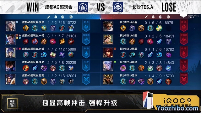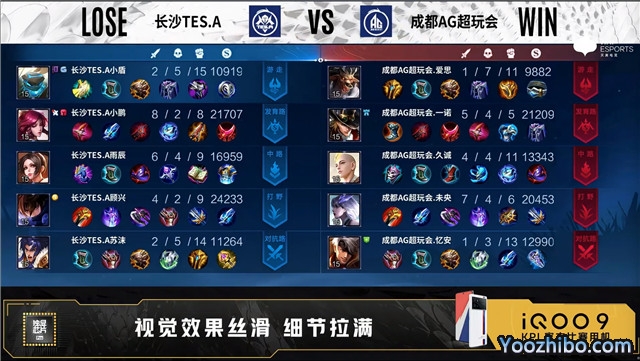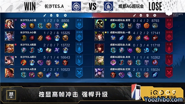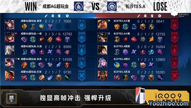 双方常规开局。2分30秒成都AG暴君处击杀张飞拿到一血。2分44秒成都AG拿下暴君。3分59秒长沙TES.A对抗路击杀周瑜。5分13秒长沙TES.A发育路击杀太乙真人。7分01秒成都AG拿下主宰。10分03秒成都AG摧毁敌方发育路二塔。10分17秒成都AG拿下暗影主宰。10分40秒成都AG摧毁敌方中路二塔。11分33秒成都AG野区击杀娜可露露。13分15秒成都AG打出0换3并摧毁敌方对抗路高地塔。13分45秒成都AG摧毁敌方中路高地塔。14分12秒成都AG拿下暗影主宰。15分19秒成都AG摧毁敌方发育路高地塔。15分29秒野区团战长沙TES.A打出0换2。16分03秒长沙TES.A拿下暗影暴君。17分39秒中路团战长沙TES.A打出1换2。18分23秒长沙TES.A拿下暗影主宰。20分13秒中路团战长沙TES.A打出1换4。20分43秒长沙TES.A团灭对手摧毁水晶拿下比赛。