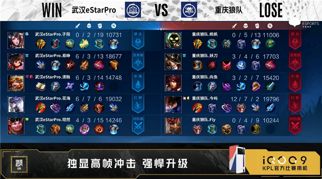 开局重庆狼队中路击杀吕布拿到一血。4分09秒发育路团战重庆狼队打出2换3。4分51秒重庆狼队野区击杀曜。6分30秒中路团战重庆狼队击杀虞姬。6分56秒重庆狼队对抗路上河道击杀不知火舞。7分43秒重庆狼队摧毁敌方中路外塔。8分24秒重庆狼队摧毁敌方中路二塔。9分40秒重庆狼队摧毁敌方对抗路二塔。9分58秒中路团战武汉eStar击杀鲁班七号。10分23秒双方主宰处1换1。11分26秒重庆狼队拿下暗影暴君,团战重庆狼队打出1换3。13分09秒野区团战重庆狼队打出0换2。13分34秒武汉eStar野区击杀关羽。13分51秒重庆狼队发育路击杀曜。15分22秒野区团战重庆狼队打出3换4,铠拿到三连决胜。16分03秒重庆狼队团灭对手摧毁水晶拿下比赛。