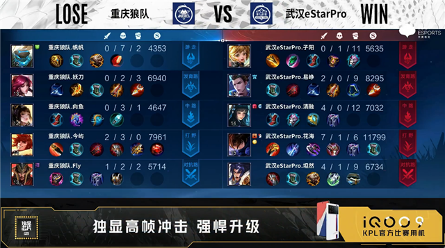 开局重庆狼队边路换线。3分10秒主宰处团战重庆狼队打出1换2。3分43秒对抗路团战重庆狼队打出1换2。4分22秒暴君处双方1换1。5分21秒重庆狼队拿下暴君。5分42秒重庆狼队摧毁敌方对抗路外塔。6分03秒武汉eStar对抗路打出0换2。8分25秒野区团战武汉eStar打出0换2。9分34秒重庆狼队拿下暴君。10分46秒武汉eStar拿下暗影主宰。11分11秒重庆狼队拿下暗影暴君,团战重庆狼队打出0换2。12分19秒重庆狼队对抗路打出1换2。12分52秒重庆狼队摧毁敌方中路、发育路二塔。14分15秒双方野区1换1。14分47秒武汉eStar中路击杀廉颇。14分52秒武汉eStar拿下暗影主宰。15分32秒野区团战重庆狼队打出0换2。17分44秒重庆狼队对抗路击杀镜。17分53秒武汉eStar拿下暗影暴君,重庆狼队击杀沈梦溪。18分45秒武汉eStar发育路打出0换2。18分52秒重庆狼队抢到暗影主宰。19分05秒武汉eStar对抗路击杀澜。21分50秒中路团战武汉eStar打出1换2。22分38秒武汉eStar拿下风暴龙王。23分48秒中路团战重庆狼队打出2换3。26分33秒武汉eStar拿下风暴龙王,团战武汉eStar打出0换4。27分08秒武汉eStar团灭对手摧毁水晶拿下比赛。